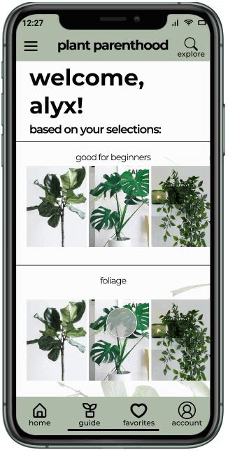 Plant Exploration: The main feedback received was the exploration and homepage did a sufficient job at organizing plant information. It allows for a user to not be overwhelmed with choices therefore having less decision fatigue throughout the process.